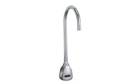 #1.5GPM Motion Activated Battery Operated Single Hole Electronic Bar / Prep Faucet with Smooth End Gooseneck Spout and Hydro Power from the Commercial Series Infrared electronic hand wash system H²OpticsTM technology- no external adjustments required Chrome plated one piece CAST main body with Integral sensor and FIXED spout Adjustable sensing range and timeout Deckmount Electronic Gooseneck Faucet Hands free (touchless) operation Water flows when sensor is activated Water flow stops upon de-activation of sensor Auto shut-off feature that is selectable between 15 and 75 seconds. Factory set to 45 seconds Will reset once obstruction is removed Adjustable sensing distance 76 to 381 mm (3" to 15"). Factory set to 229 mm (9") (+/- 1.0") Plastic SURFACE Mount Housing-REQUIRES SINGLE TEMPERED WATER SUPPLY