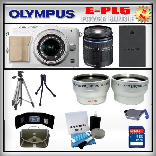 Olympus PEN E-PL5 White 16MP Digital Camera - Olympus 14-42mm Lens - Olympus 40-150mm Lens - Wide Angle and Telephoto Zoom Lens - 16GB SDHC Memory Card - USB Memory Card Reader - Memory Card Storage Wallet - Spare Battery - Carrying Case - Lens Cleaning Kit - Full Size and Mini Tripods