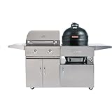 Primo Ceramic Kamado Grill And 26-inch Natural Gas Grill On Cart. Primo Ceramic Kamado And 26-Inch Natural Gas Grill On Cart. GJ26N + 779 + CGJ26C. Cart Mounted Charcoal Grills. Primo combines the convenience of gas grill cooking with the deliciousness of Kamado-smoked bbq flavor, for the best of both worlds on one space-saving cart. The Kamado Joe 26-inch GasJoe natural gas grill has two tube-style burners that each deliver 16,000 BTUs of cooking power for a total of 32,000 BTUs on the cooking surface. Flash tube ignition sends a steady, reliable flame across durable 8mm stainless steel cooking rods that maximize your searing capability on 444 square inches of primary cooking area. The warming rack expands your cooking area an additional 154 square inches, for a total of 598 square inches of grilling space. The flame tamer reduces unwanted flare-ups while you cook, and the full-size drip tray makes grease management a breeze. The grill knobs are a zinc alloy cast for higher impact resistance, meaning that normal wear and tear will not affect grill appearance or performance. Polished edges and accents bring a touch of elegance to the unique craftsmanship of the grill, and the corrosion resistant 304 stainless steel grill hood combats the outdoor elements with heavy-duty quality. The Primo black ceramic Kamado grill has easy to clean and reversible porcelain-coated cooking grates as well as one of the highest sitting lids on the market which is great for cooking whole chickens. Primo kamado grills are proudly made in the USA, constructed with premium grade Primo SuperCeramics and coated with a protective, lead-free, and scratch-resistant porcelain glaze. The patented Primo grill design efficiently retains and evenly distributes heat across the 280 square inches of cooking surface, perfect for maintaining a consistent temperature. Smoke meat at temperatures as low as 180 degrees Fahrenheit, or turn up the heat to more than 500 degrees Fahrenheit for steakhouse-style searing and grilling. Use the cast iron chimney cap, stainless stee