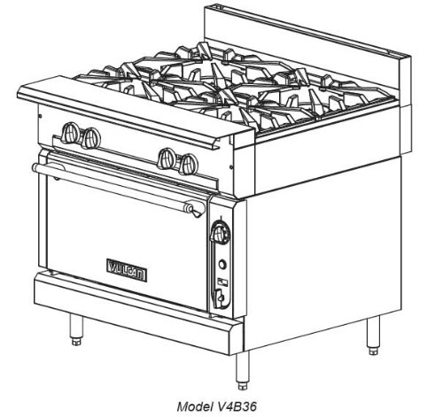 Vulcan Hart V Series 36" Gas Range W/ 4 Burners And Cabinet Base - V4B36B?Vulcan Hart V Series 36" Gas Range w/ 4 Burners and Cabinet BaseThis range has four 33,000 BTU/hr burners with lift off heads and a stainless steel base with universal rack guides.Natural Gas Model #: V4B36B Material: Stainless steel Color: Silver 6" adjustable legs Removable shelf 33,000 BTU/hr top burners Individual pilot and controls Heavy duty cast grates 4" stainless steel stub riser NSF listed One year limited warranty Height: 36" Width: 36" Depth: 36-3/4" Weight: 380 lbs 854923